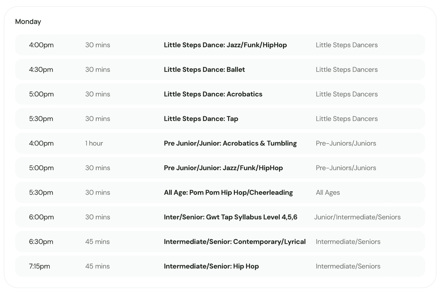 Browse our weekly timetable and see what fits your schedule.